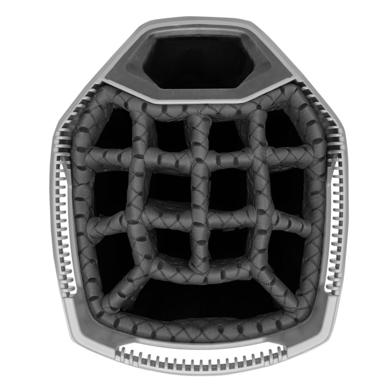 The Maverick is a lightweight riding cart bag with all pockets facing forward for easy access on the cart. It has two handles on top to help lift it on and off. Full-length dividers keep clubs organized and protected.